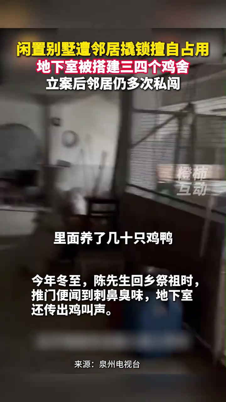 >闲置别墅遭邻居撬锁擅自占用,地下室被搭建三四个鸡舍!!