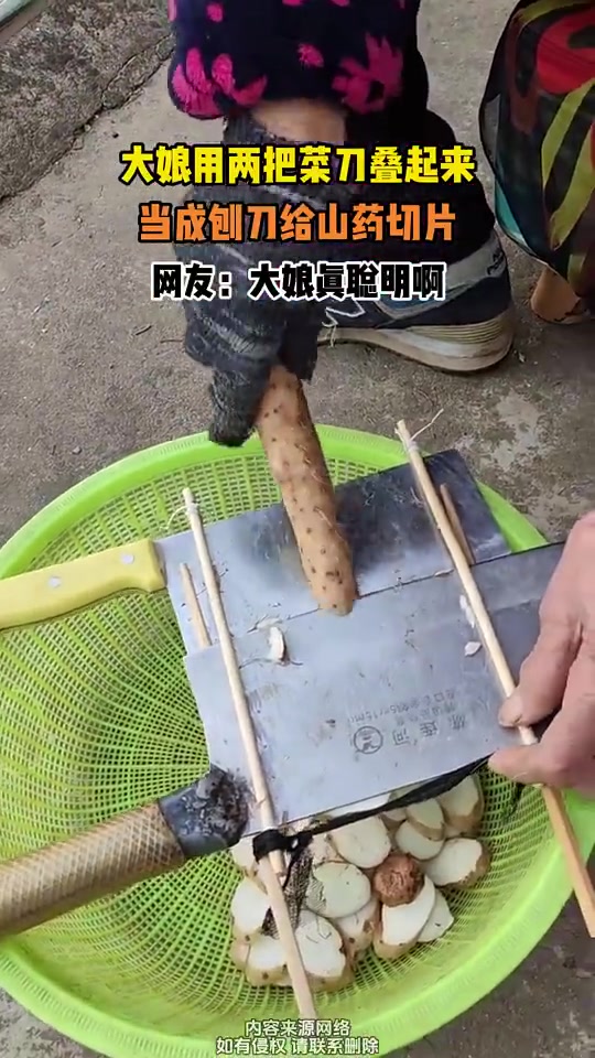 >大娘用两把菜刀叠起来,当成刨刀给山药切片,网友:大娘真聪明啊