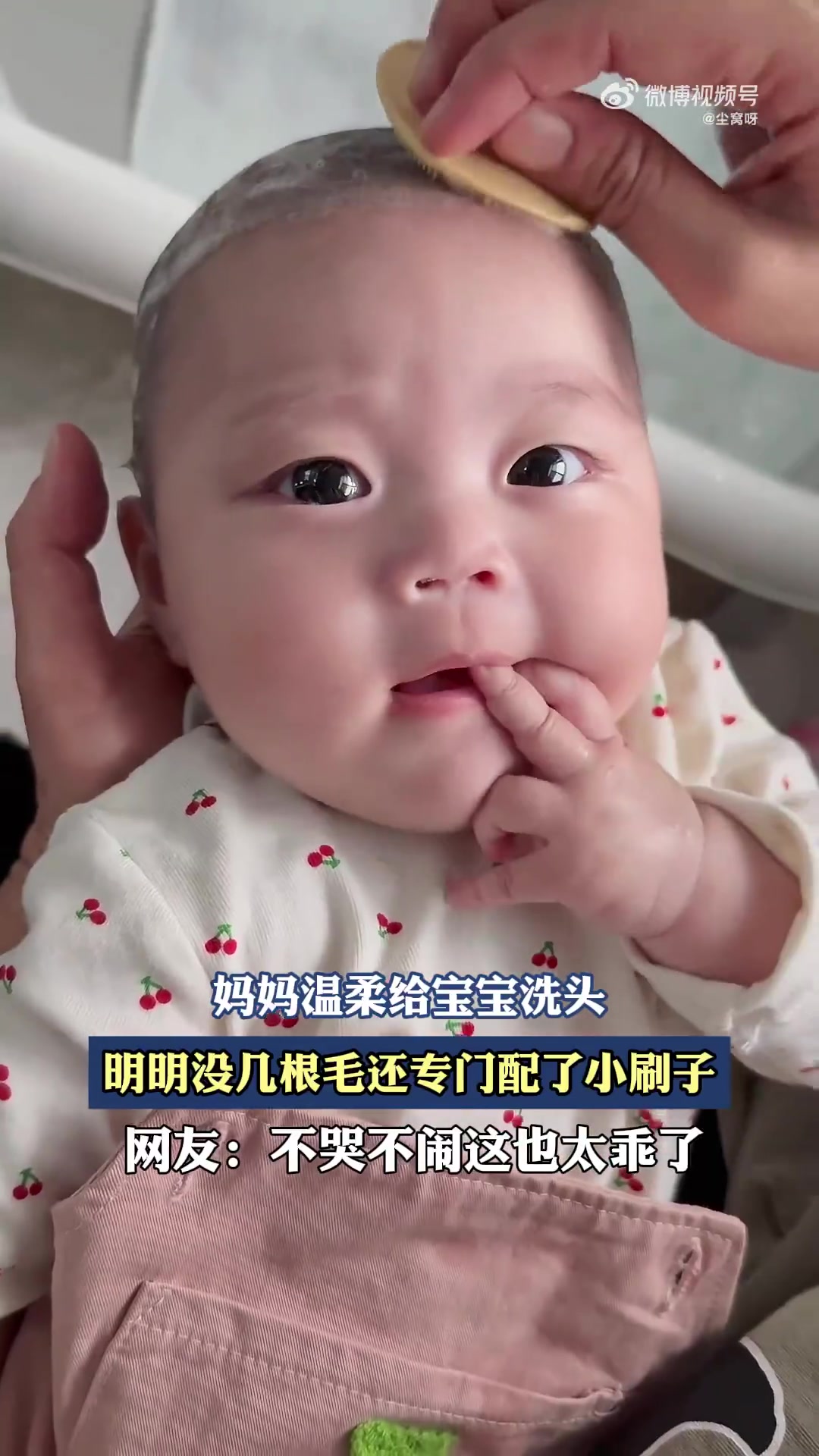 妈妈温柔给宝宝洗头,没几根毛还配小刷子