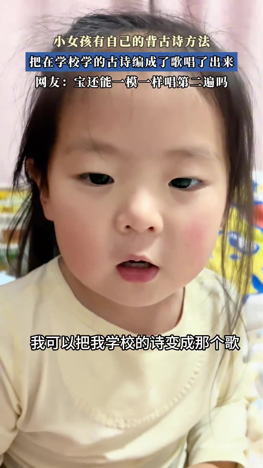 >小女孩有自己的背古诗方法,把在学校学的古诗编成了歌唱了出来