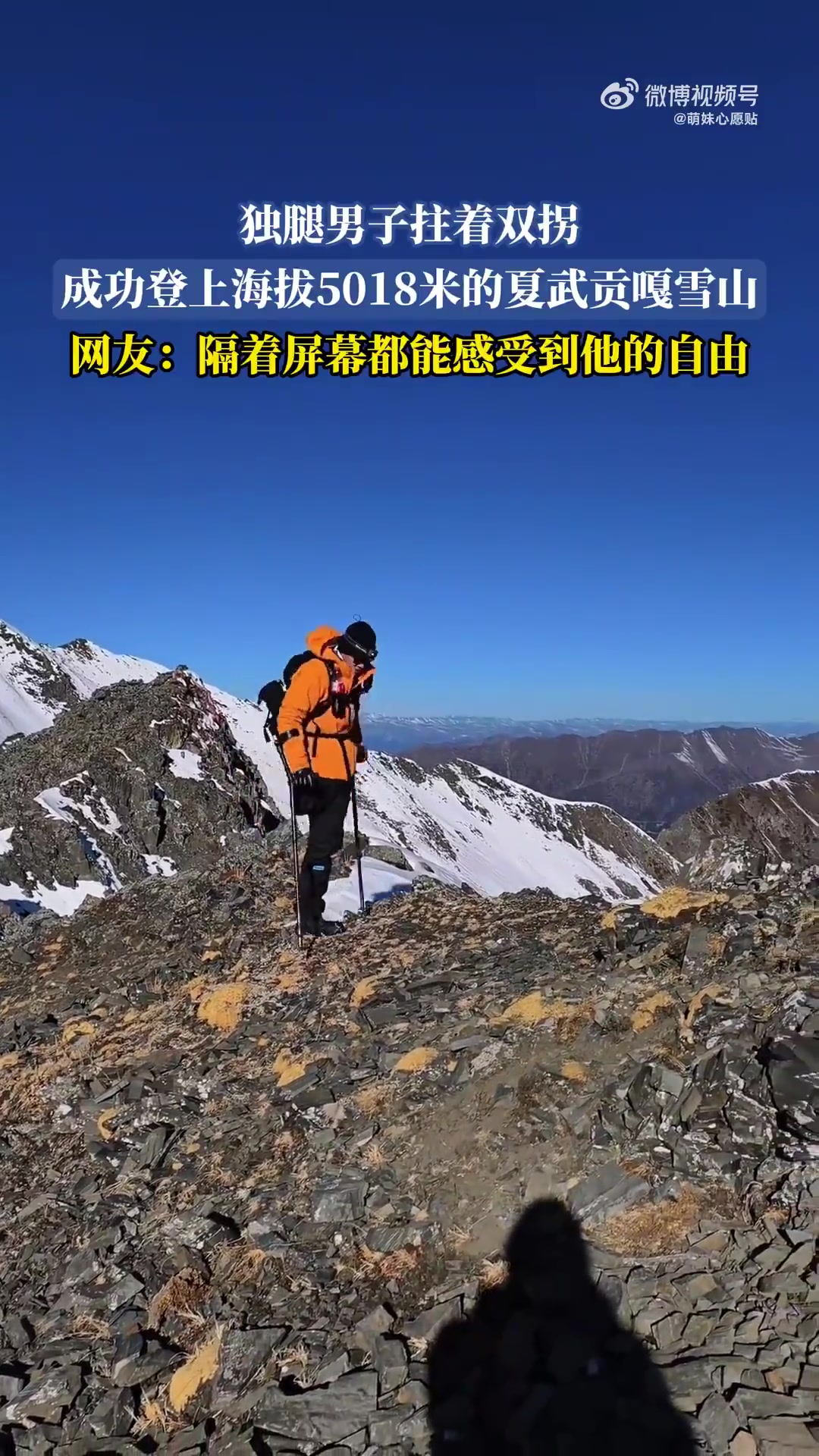 独腿男子拄拐成功登顶海拔5018米夏武贡嘎雪山