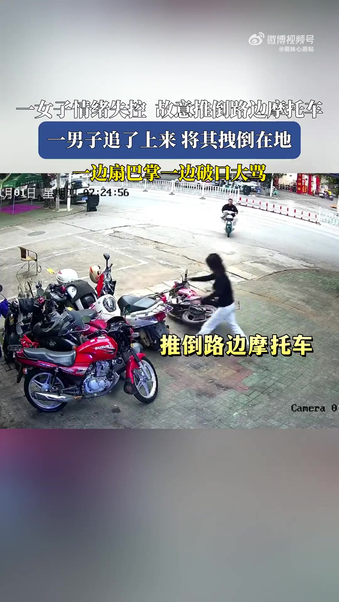 >女子情绪失控推倒摩托车,遭男子拽倒扇骂