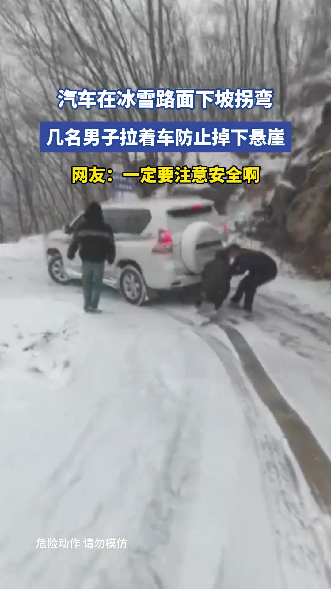 汽车在冰雪路面下坡拐弯,几名男子拉着车防止掉下悬崖
