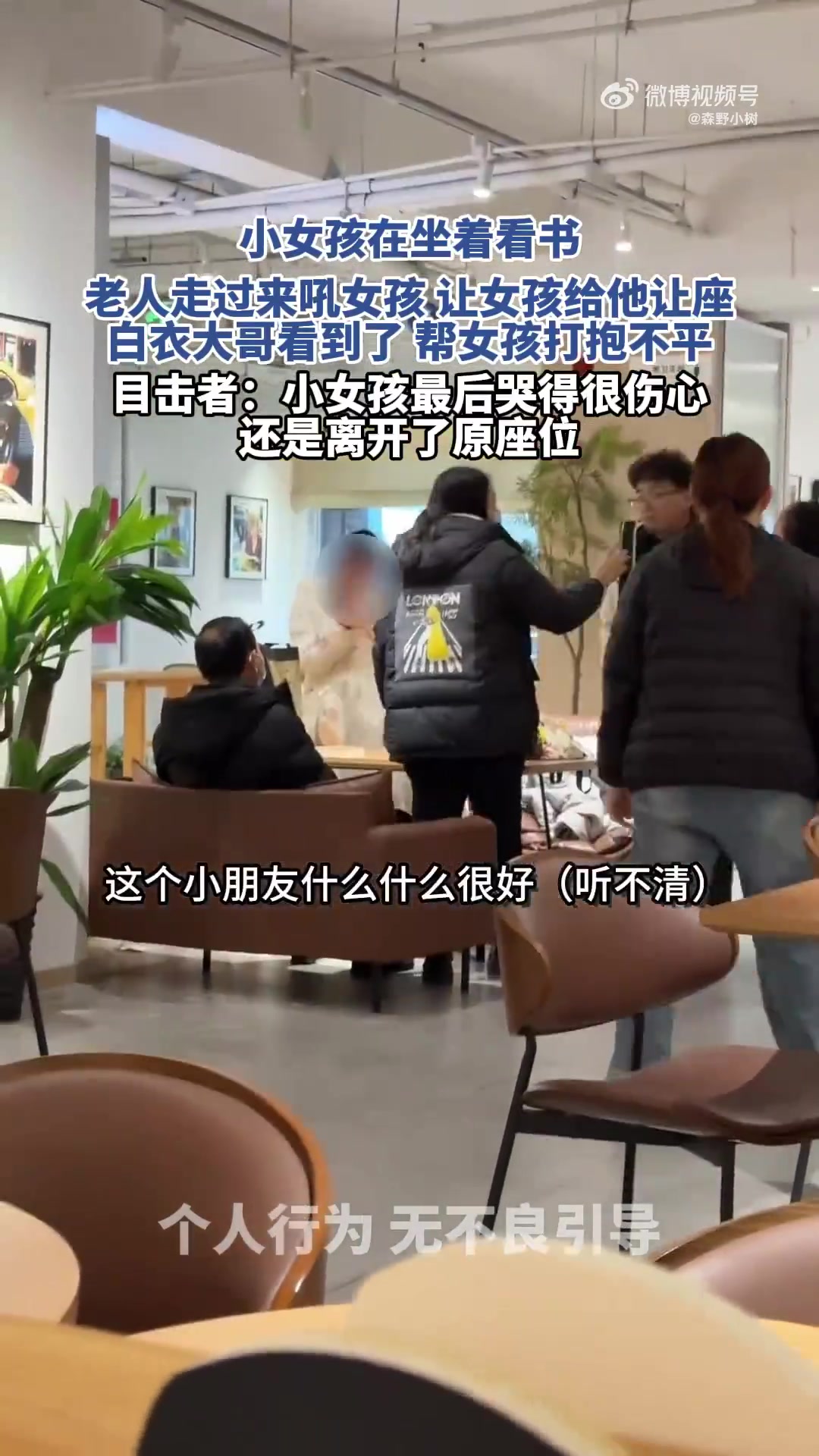 >小女孩看书时,被老人吼着让座