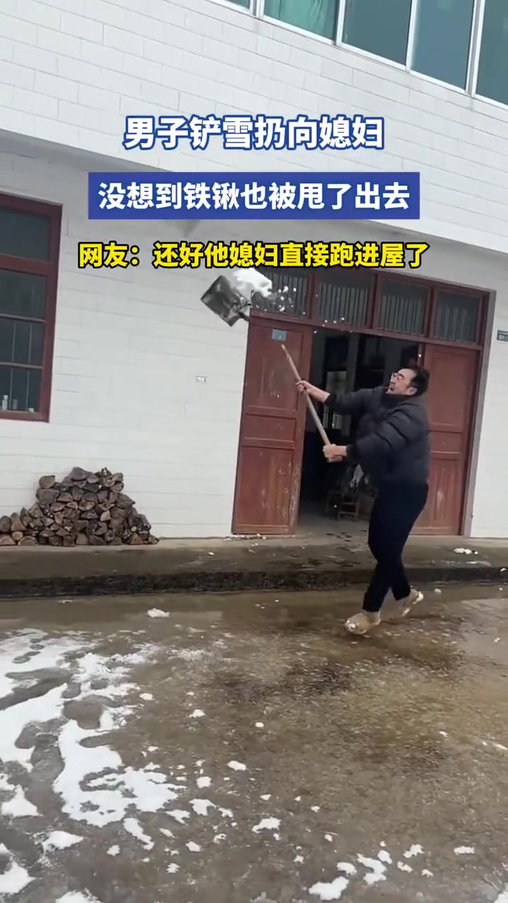 男子铲雪扔向媳妇,没想到铁锹也被甩了出去,还好媳妇进屋了!!
