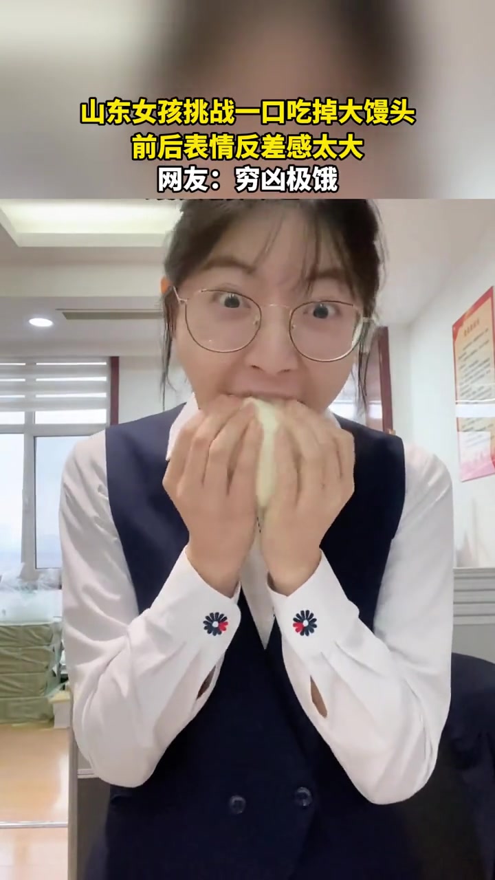 >山东女孩挑战一口吃掉大馒头,前后表情反差感太大!