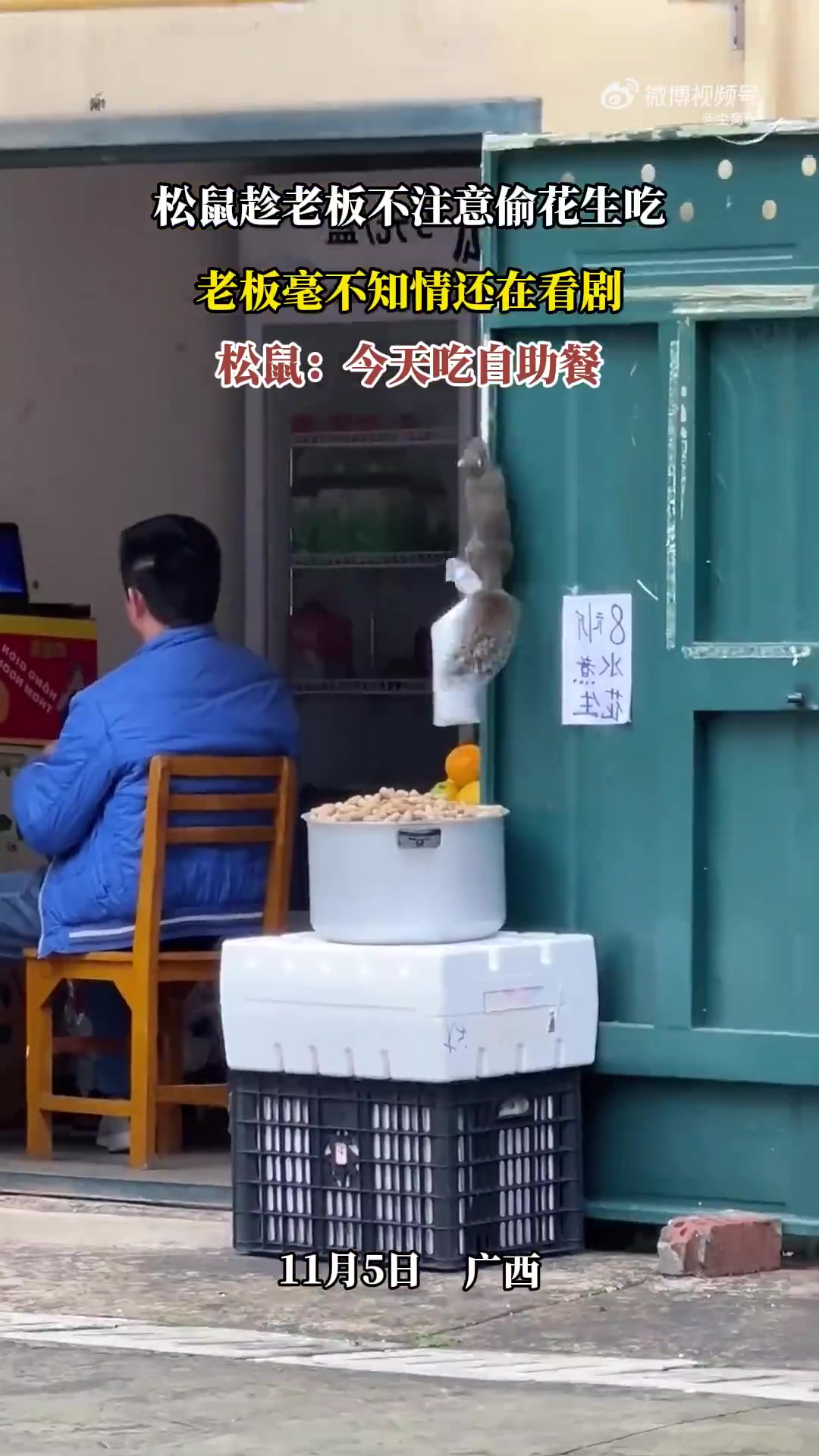 松鼠趁老板看剧偷花生,网友调侃“吃自助餐”