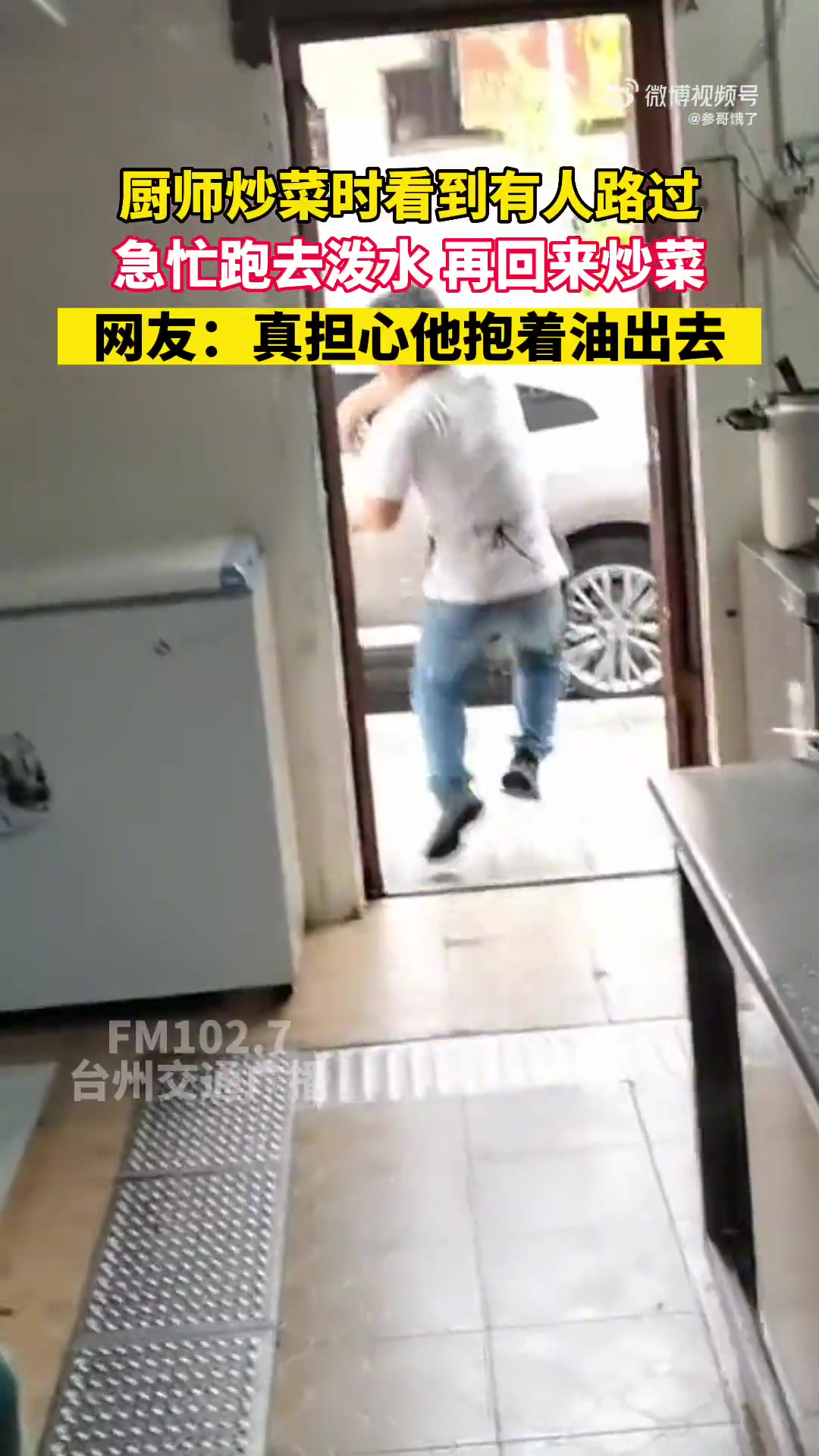 >厨师炒菜时看到有人路过,急忙跑去泼水再回来炒菜。