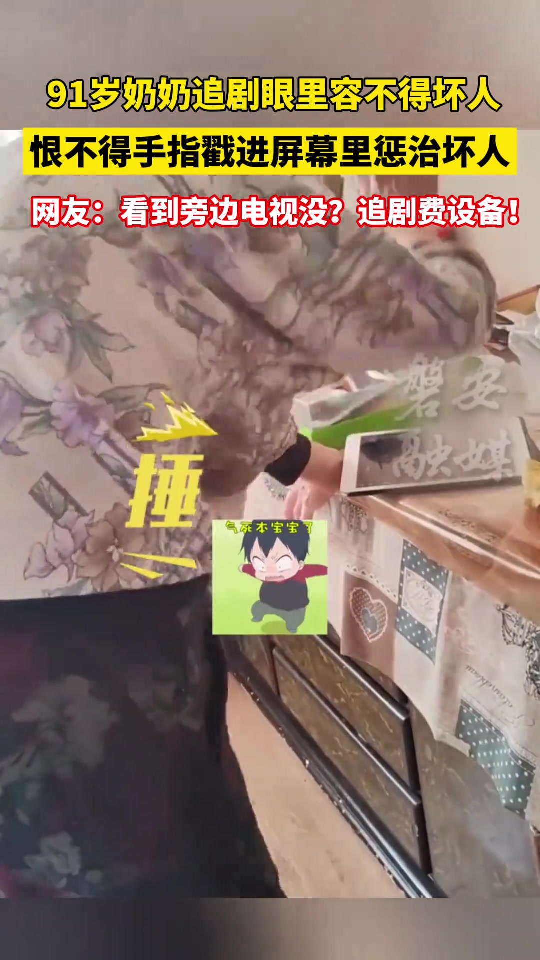 >91岁奶奶追剧眼里容不得坏人,恨不得手指戳进屏幕里惩治坏人!