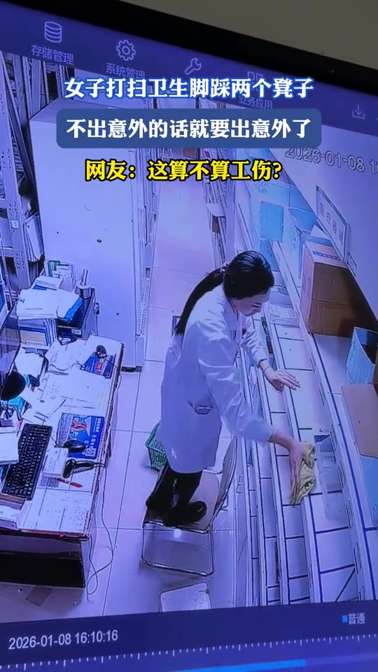 >女子打扫卫生脚踩两个凳子,不出意外的话就要出意外了