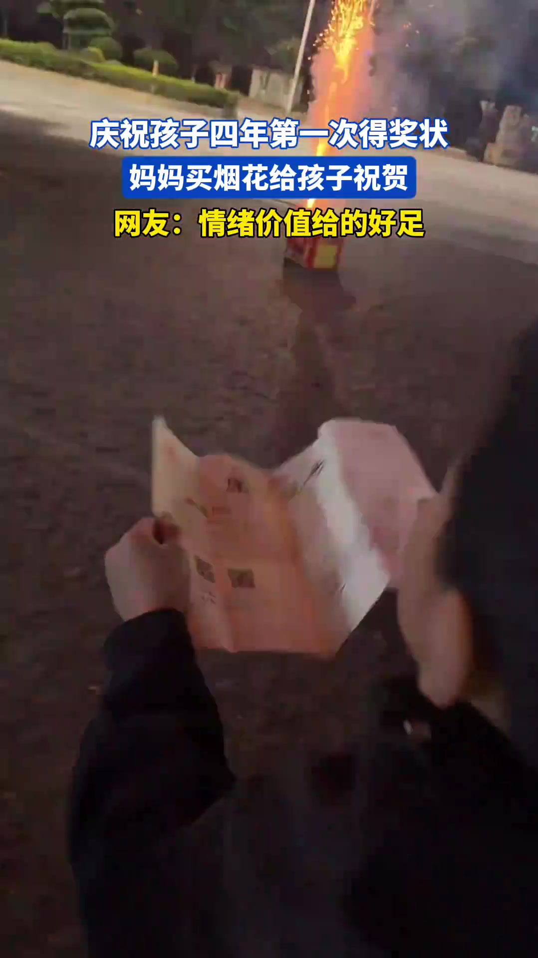 >庆祝孩子四年第一次得奖状,妈妈买烟花给孩子祝贺