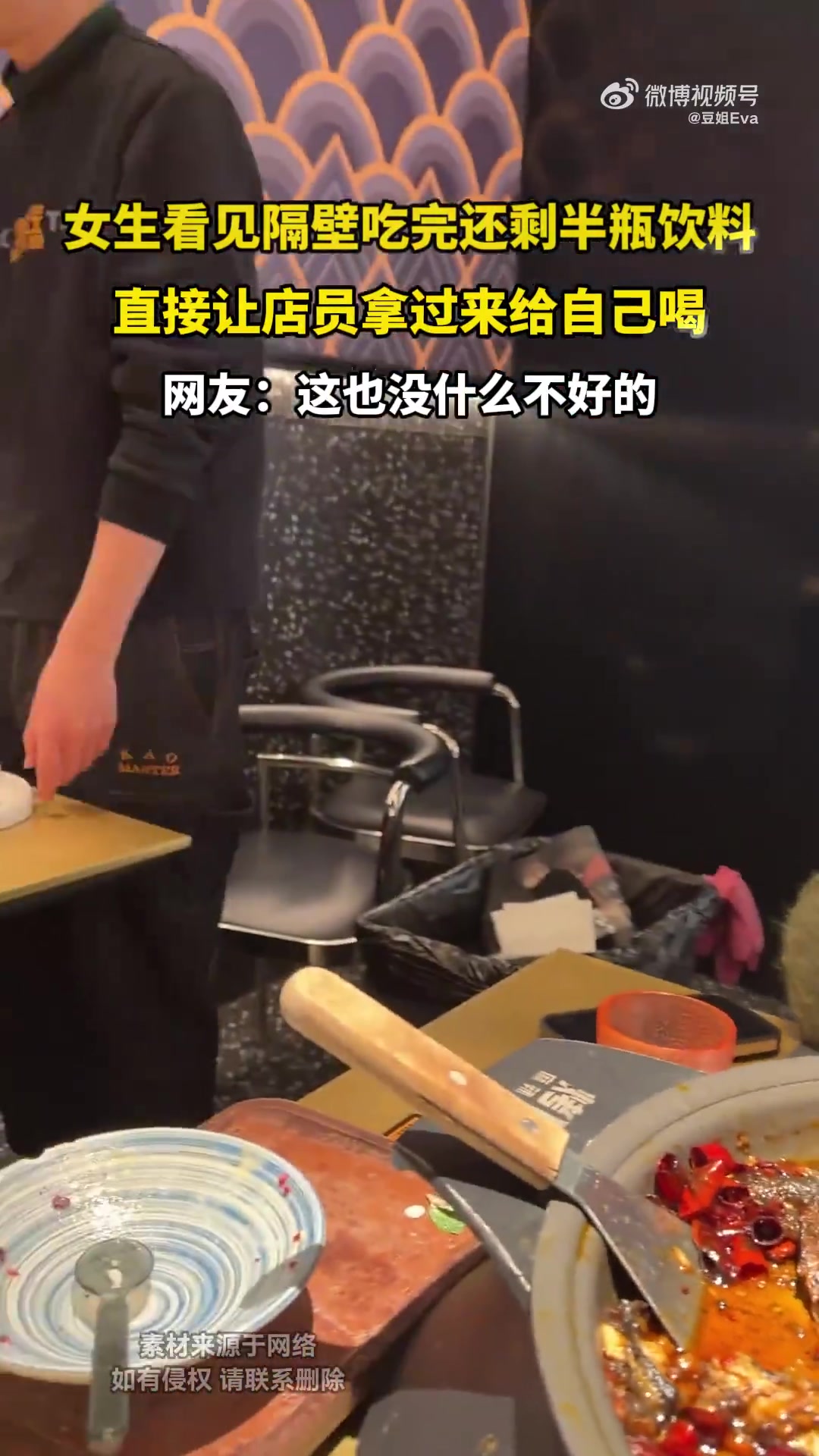 女生看见隔壁吃完还剩半瓶饮料,直接让店员拿过来给自己喝
