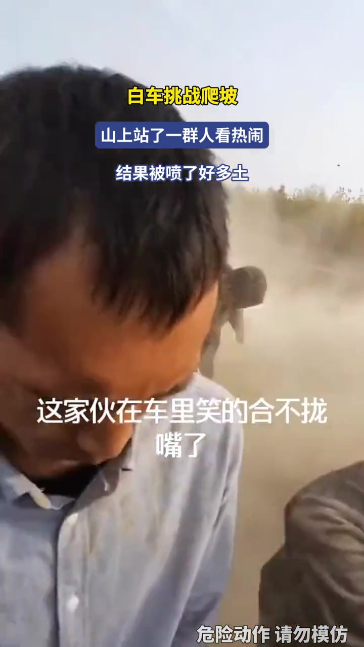 >白车挑战爬坡,山上站了一群人看热闹,结果被喷了好多土!!