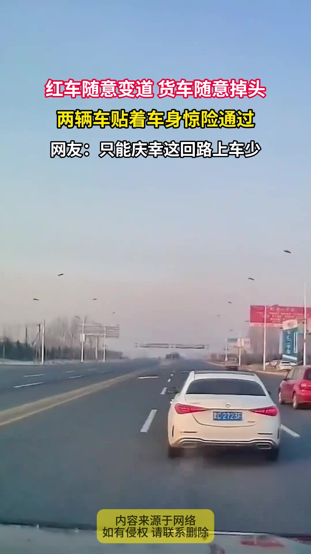 >红车随意变道 货车随意掉头,两辆车贴着车身惊险通过