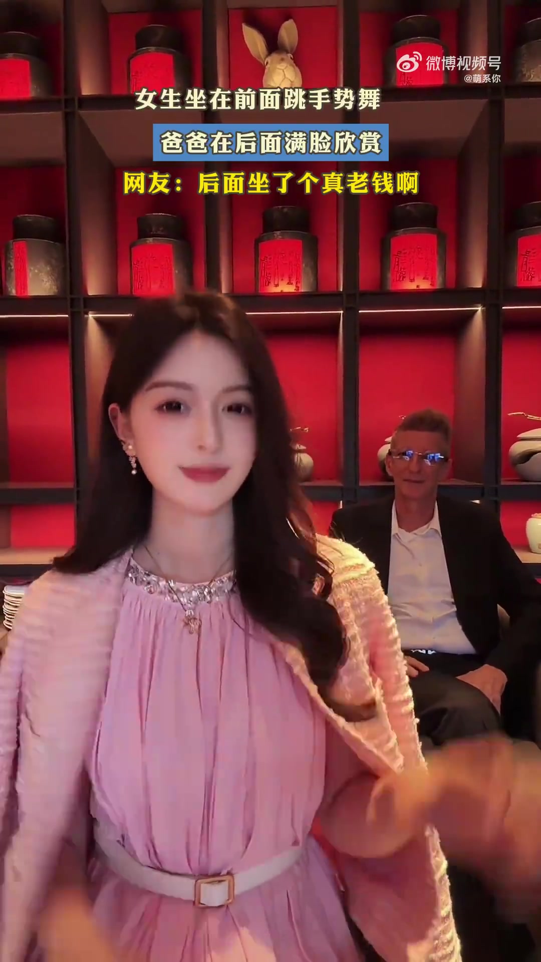 女生坐在前面跳手势舞,爸爸在后面满脸欣赏!