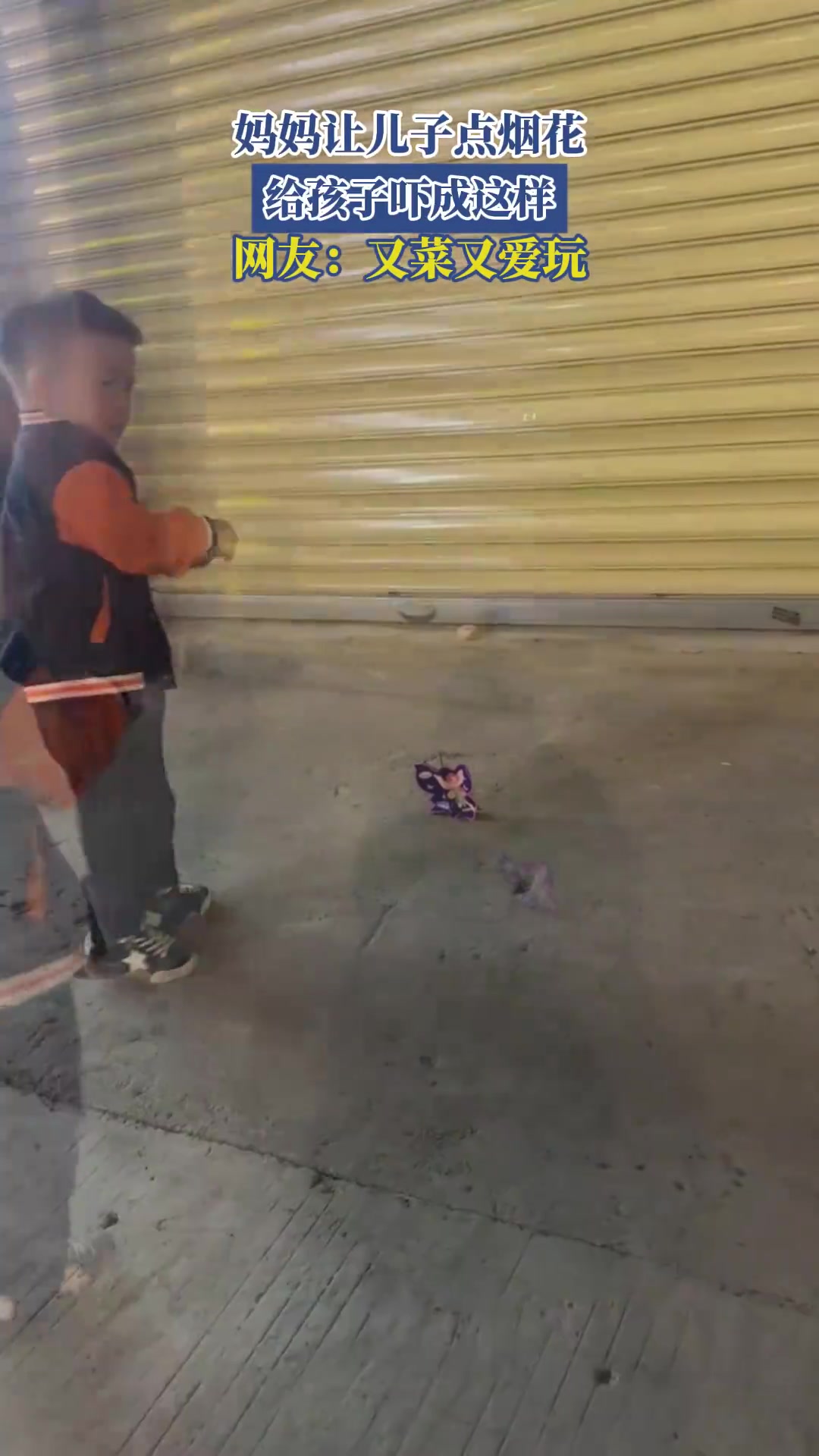 >妈妈让儿子点烟花,给孩子吓成这样,网友:又菜又爱玩