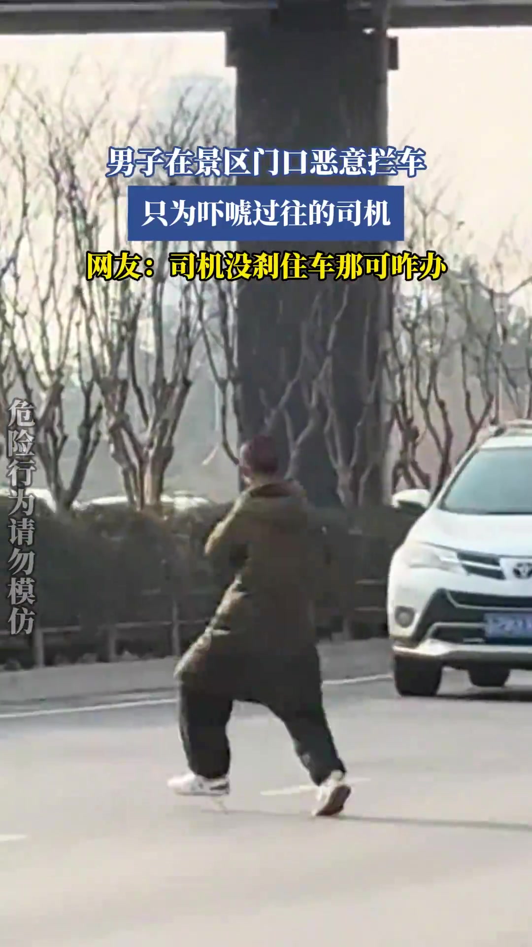 男子在景区门口恶意拦车,只为吓唬过往的司机