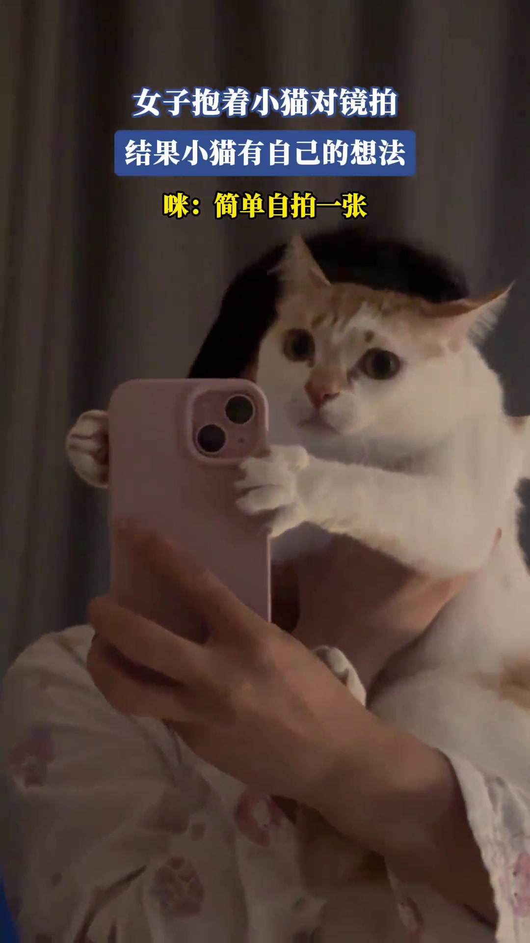 >女子抱着小猫对镜拍,结果小猫有自己的想法