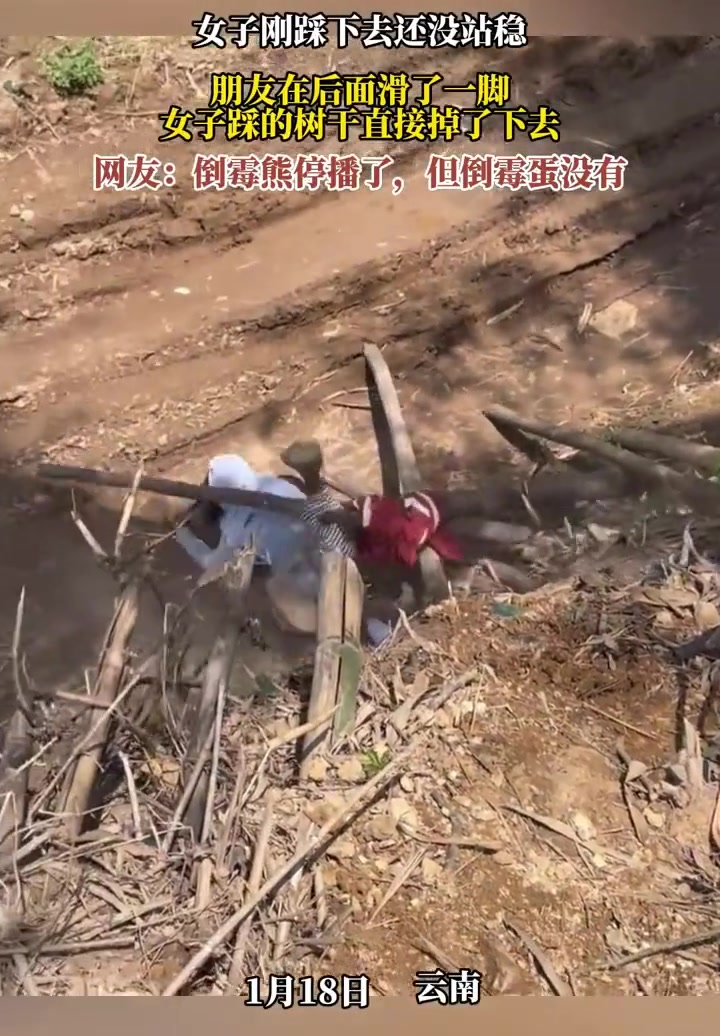 女子刚踩下去还没站稳,朋友在后面滑了一脚,女子踩的树干掉下去