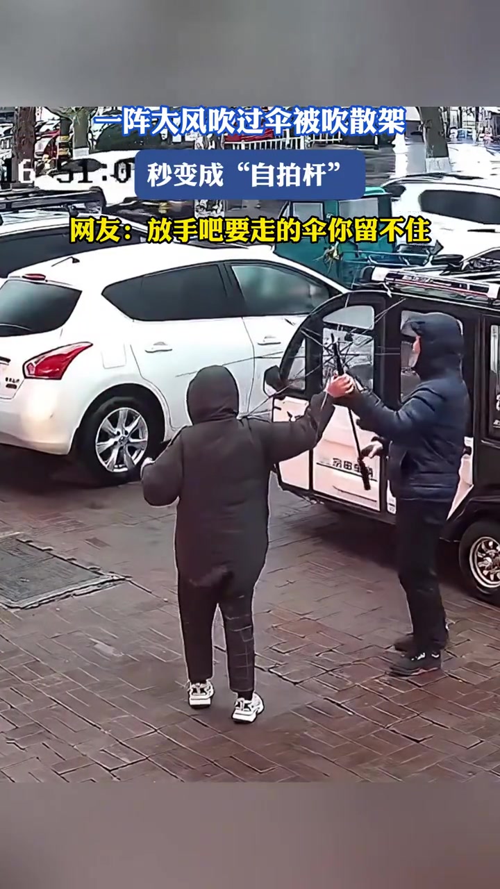 一阵大风吹过伞被吹散架,秒变成“自拍杆”!!