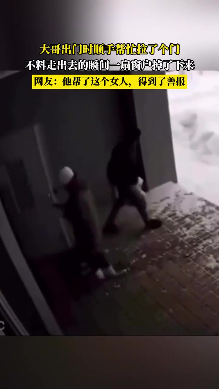 大哥出门时顺手帮忙拉了个门,不料走出去的瞬间一扇窗户掉了下来
