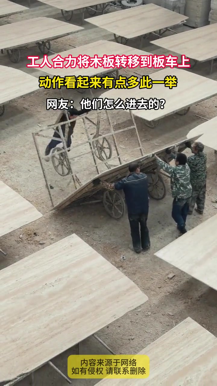 工人合力将木板转移到板车上,动作看起来有点多此一举!!