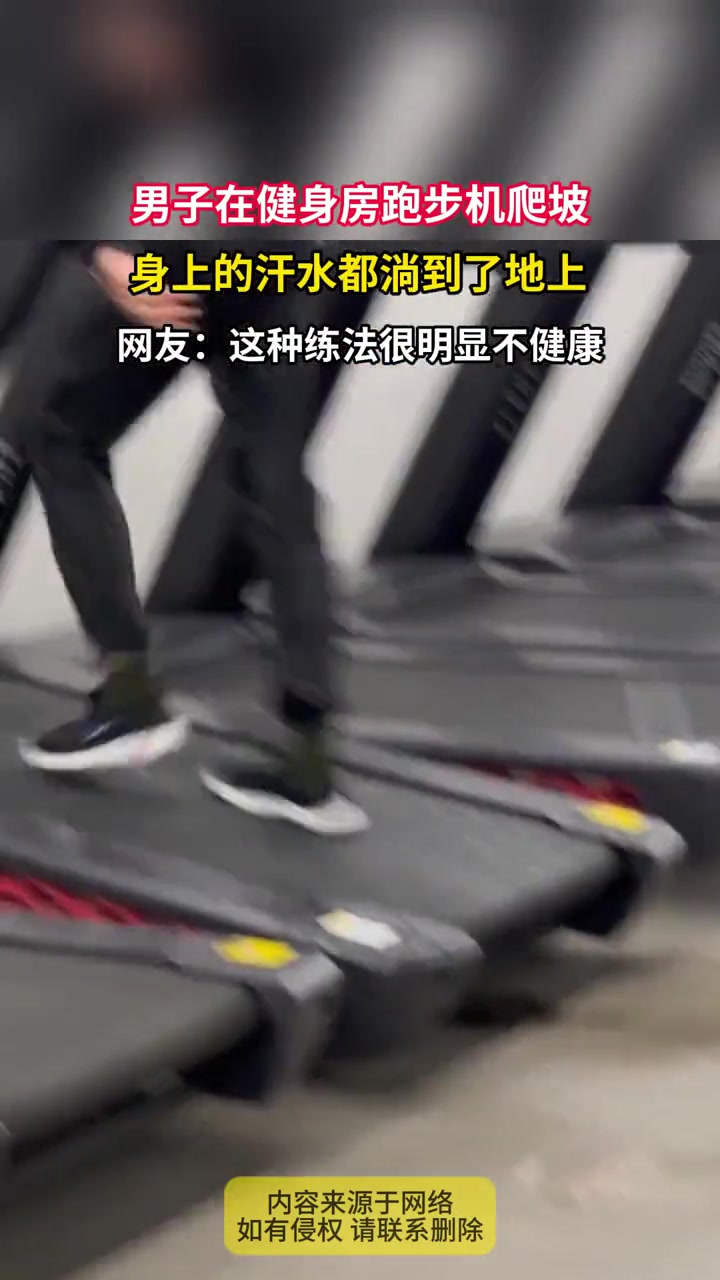 男子在健身房跑步机爬坡,身上的汗水都淌到了地上!!