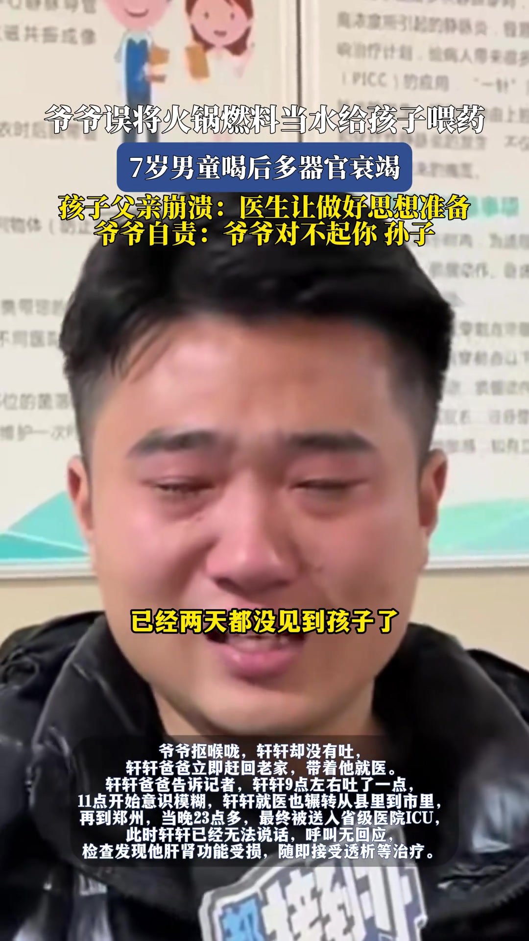 >爷爷误将火锅燃料当水给孩子喂药,7岁男童喝后多器官衰竭