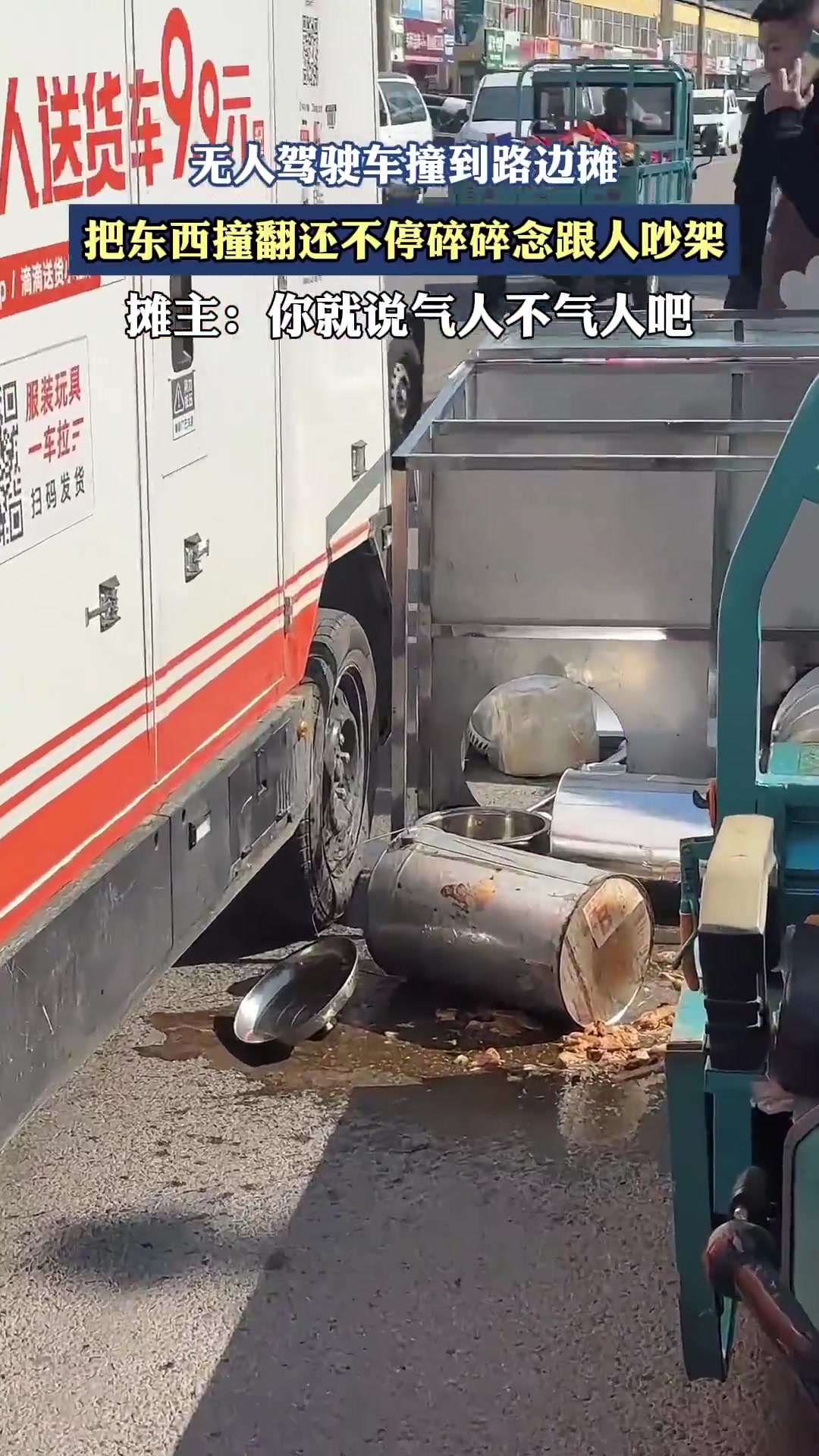 无人驾驶车撞路边摊,还碎碎念吵架!