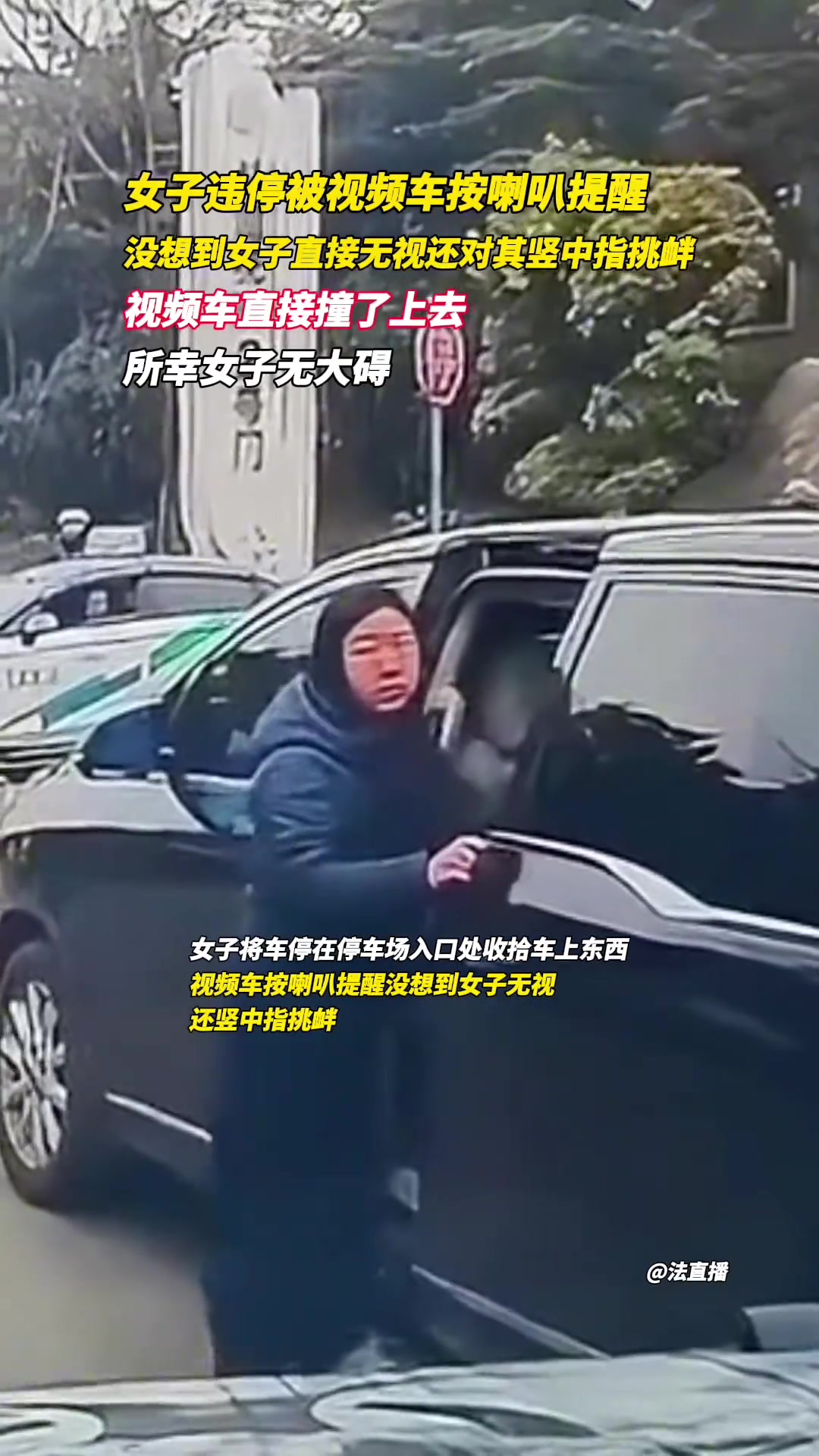 >女子违停还竖中指挑衅,视频车司机直接一脚油门撞了上去