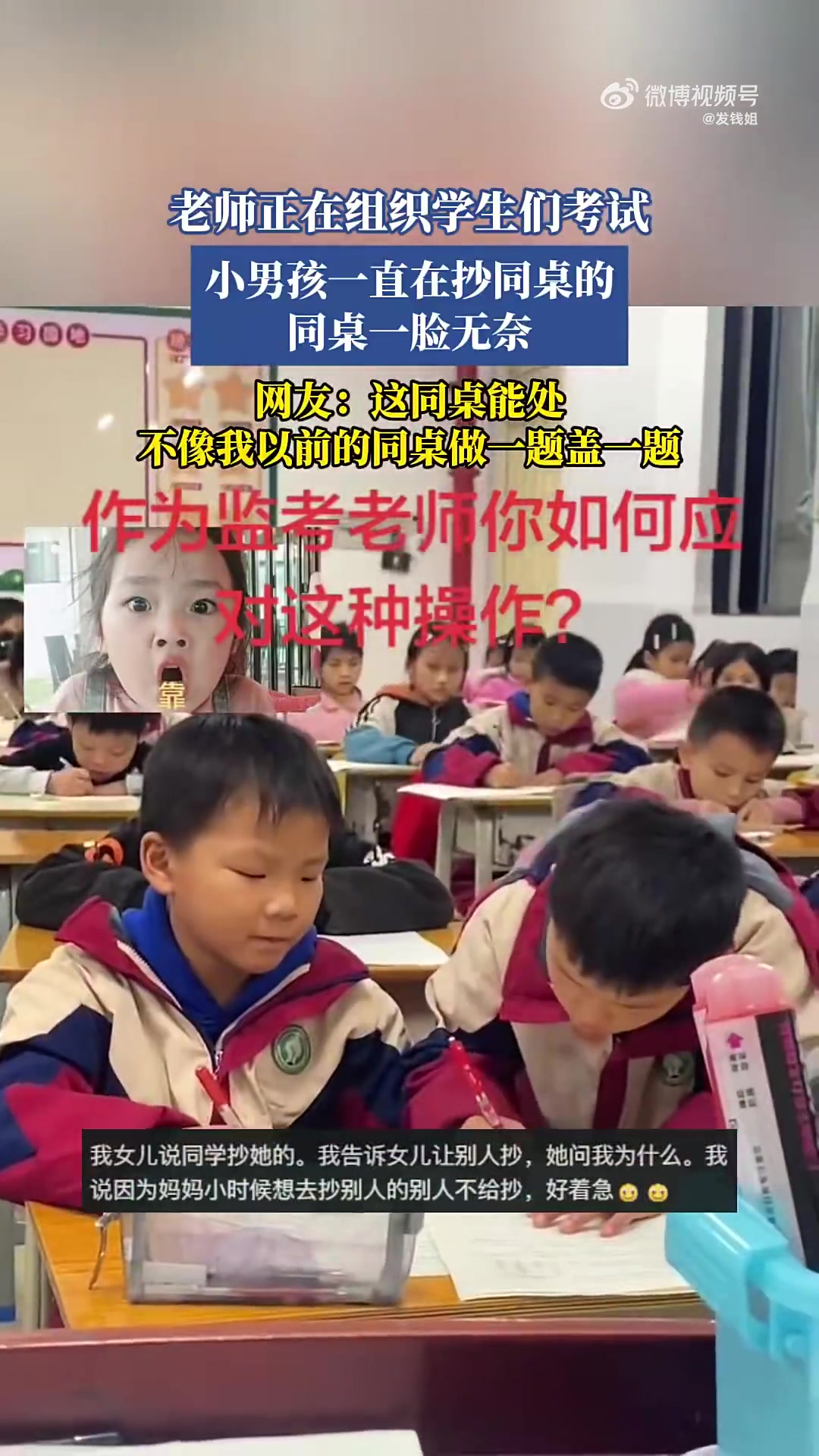 老师正在组织学生们考试,小男孩一直在抄同桌的 同桌一脸无奈