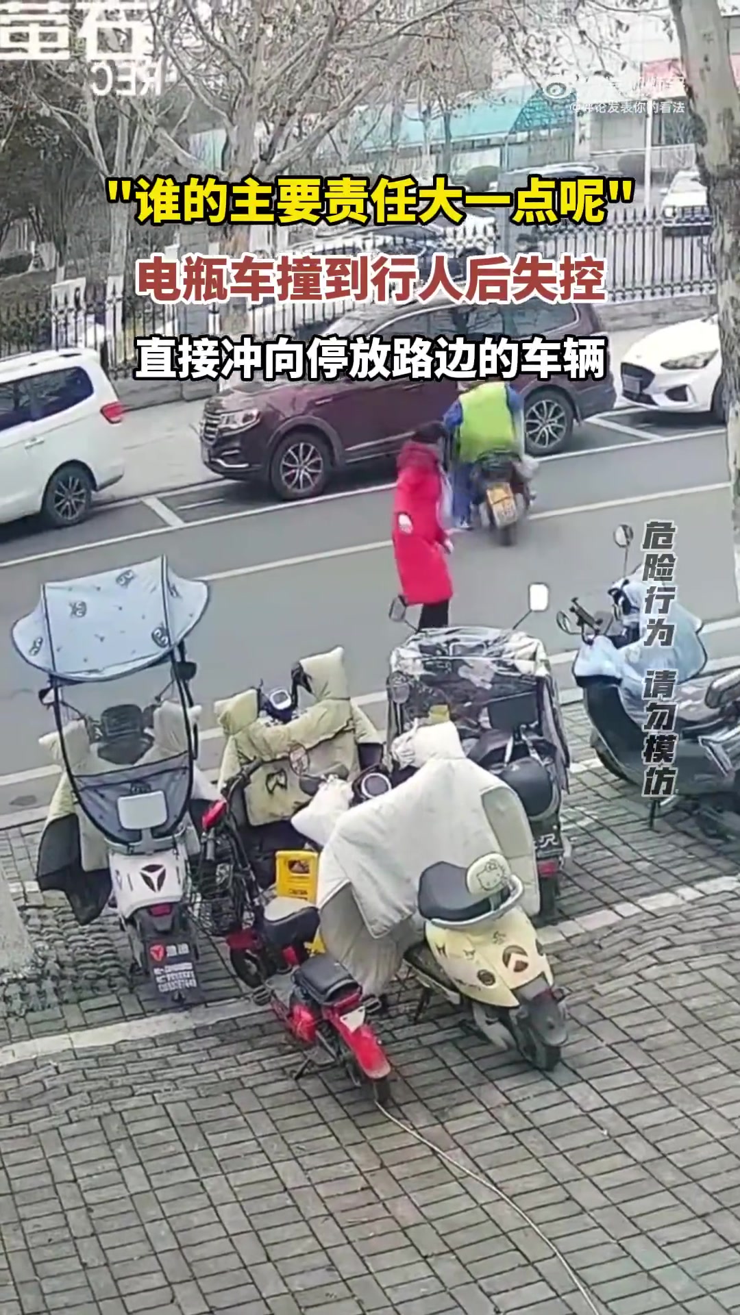 >电瓶车撞行人后失控,径直冲向路边停放车辆