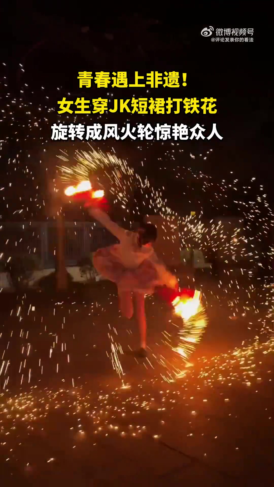 女生穿 JK 短裙打铁花,旋转成风火轮惊艳众人