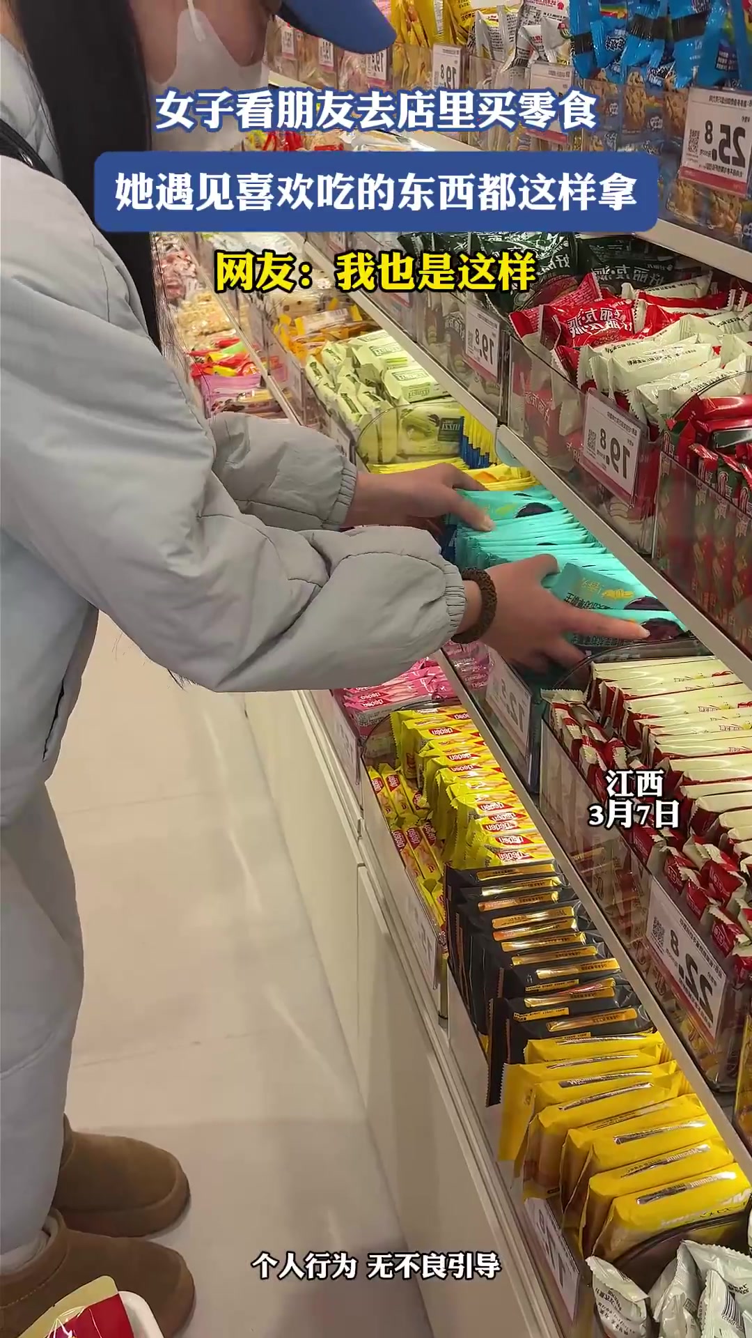 女子看朋友去店里买零食,她遇见喜欢吃的东西都这样拿