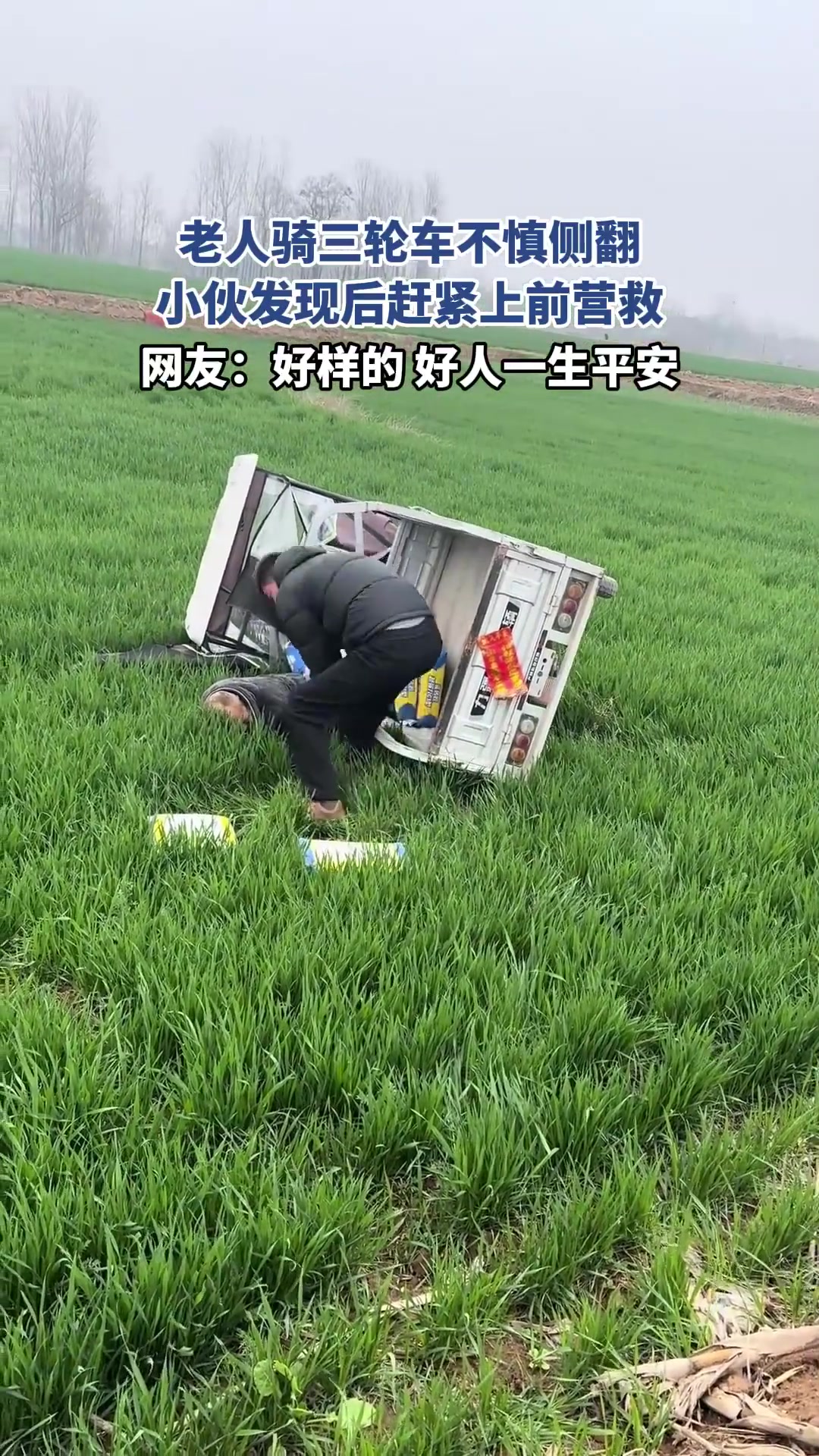 >老人骑三轮车不慎侧翻,小伙发现后赶紧上前营救