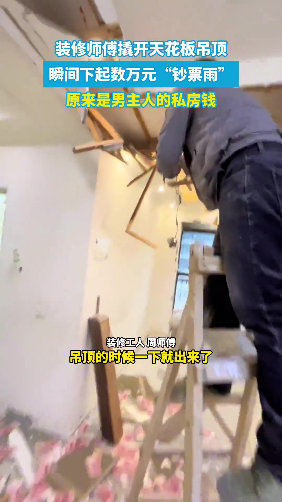 装修师傅撬开天花板吊顶,瞬间下起数万元“钞票雨”