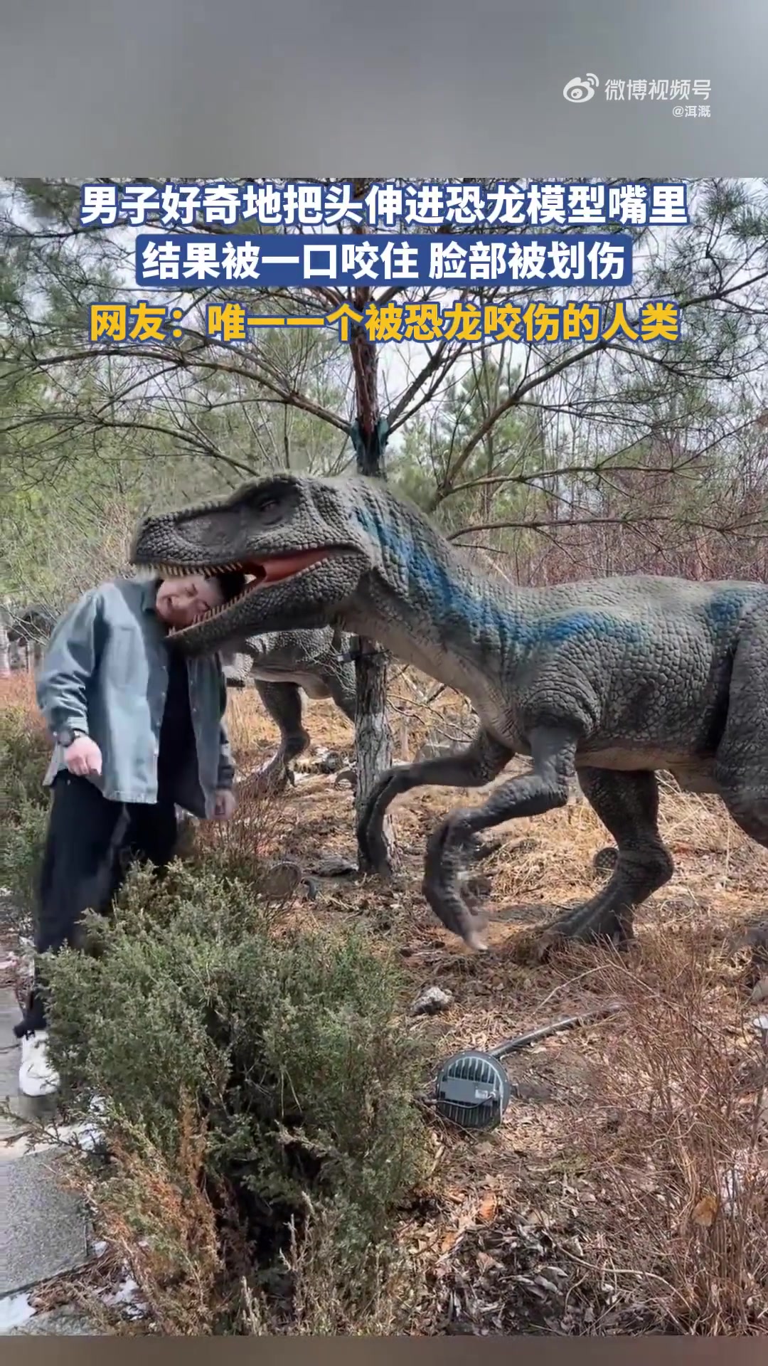 男子好奇地把头伸进恐龙模型嘴里,结果被一口咬住脸部被划伤!