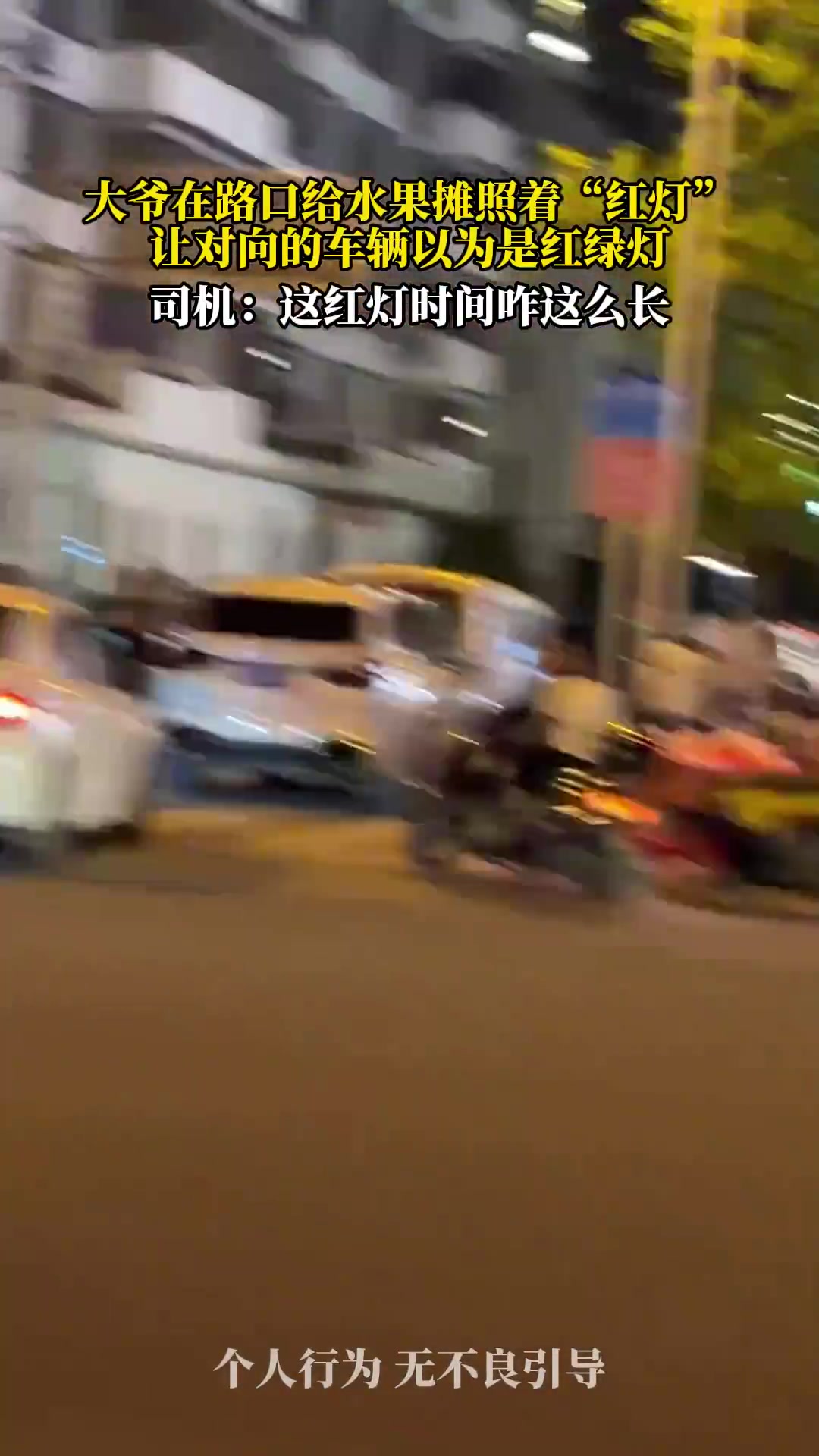 >大爷在路口给水果摊照着“红灯”,让对向的车辆以为是红绿灯!!