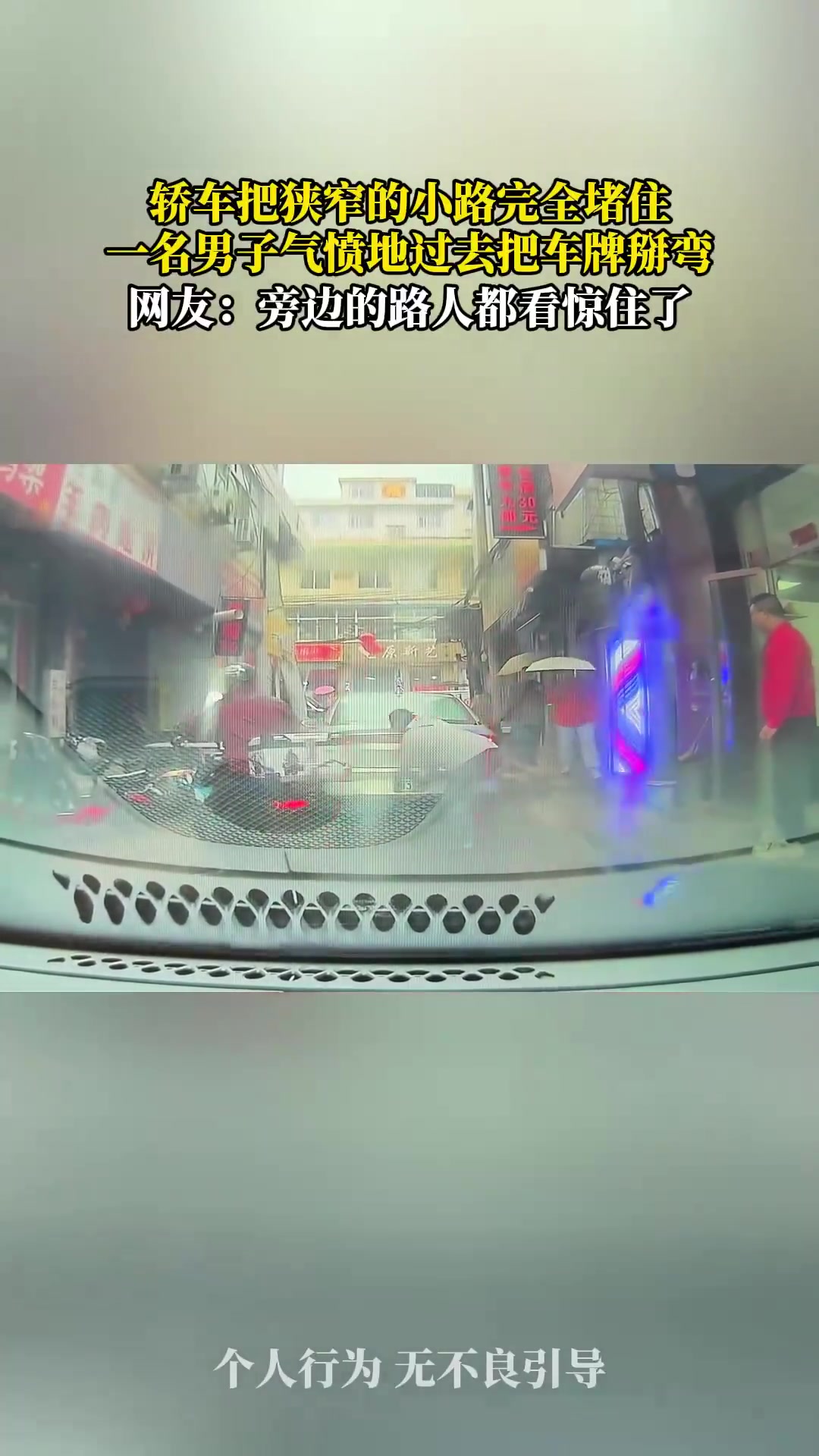 轿车把狭窄的小路完全堵住,一名男子气愤地过去把车牌掰弯!!