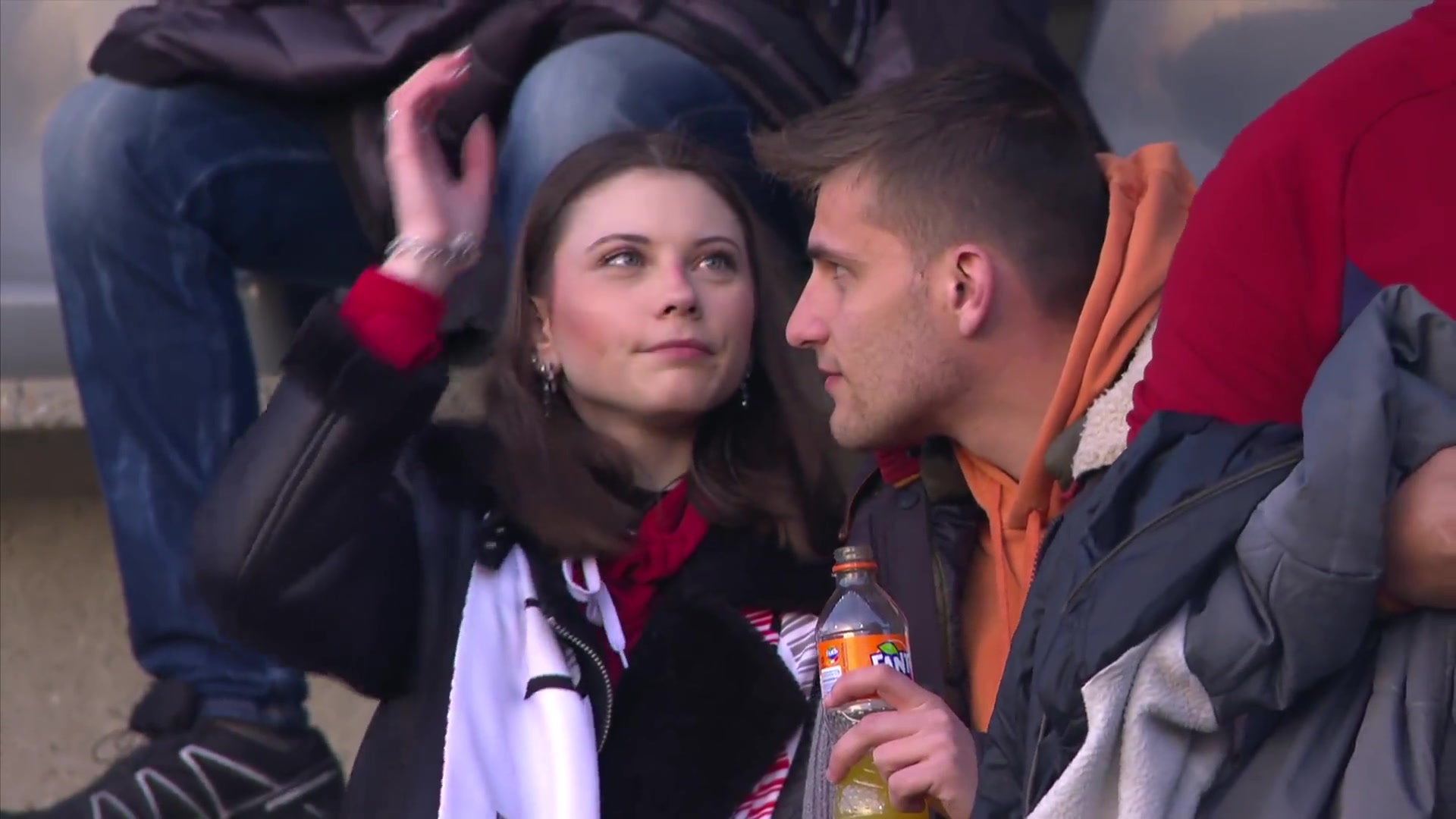 >单身狗看哭了!女球迷一眼爱意给男友整理发型