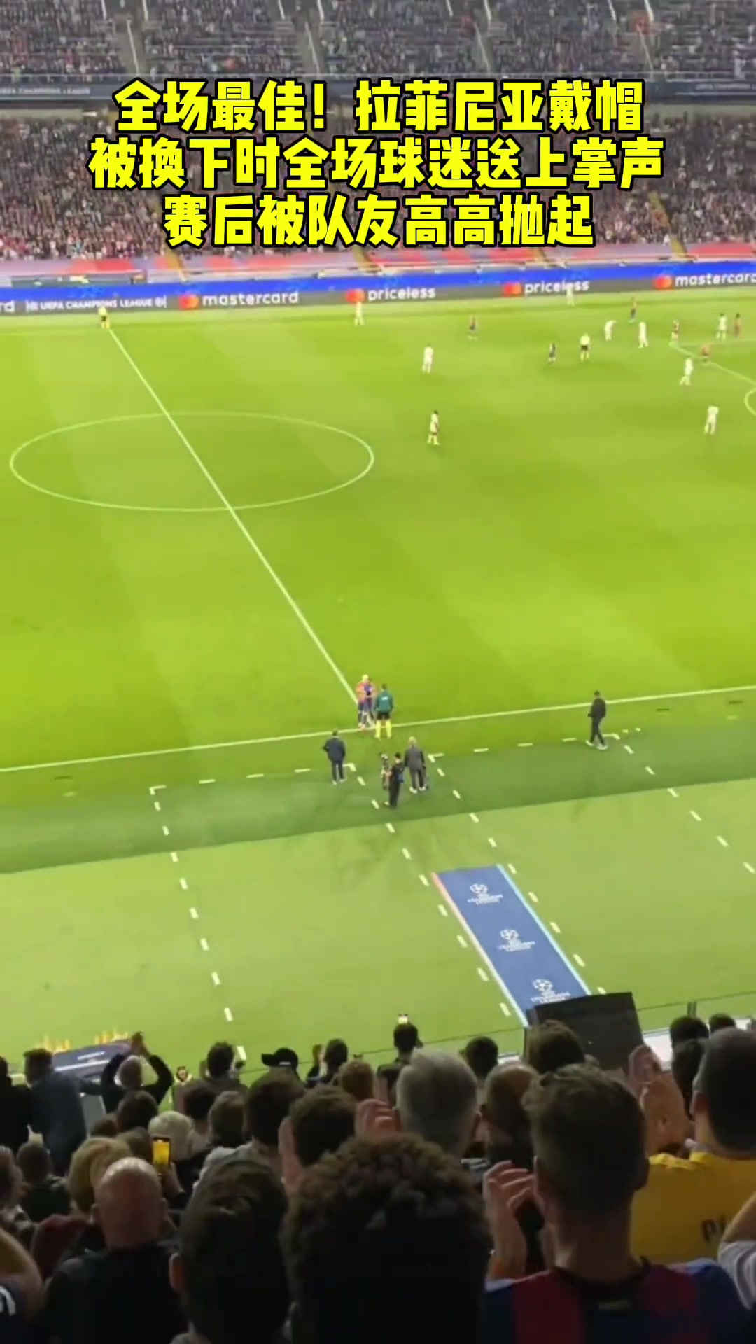 拉菲尼亚戴帽,被换下时全场球迷送上掌声,赛后被队友高高抛起