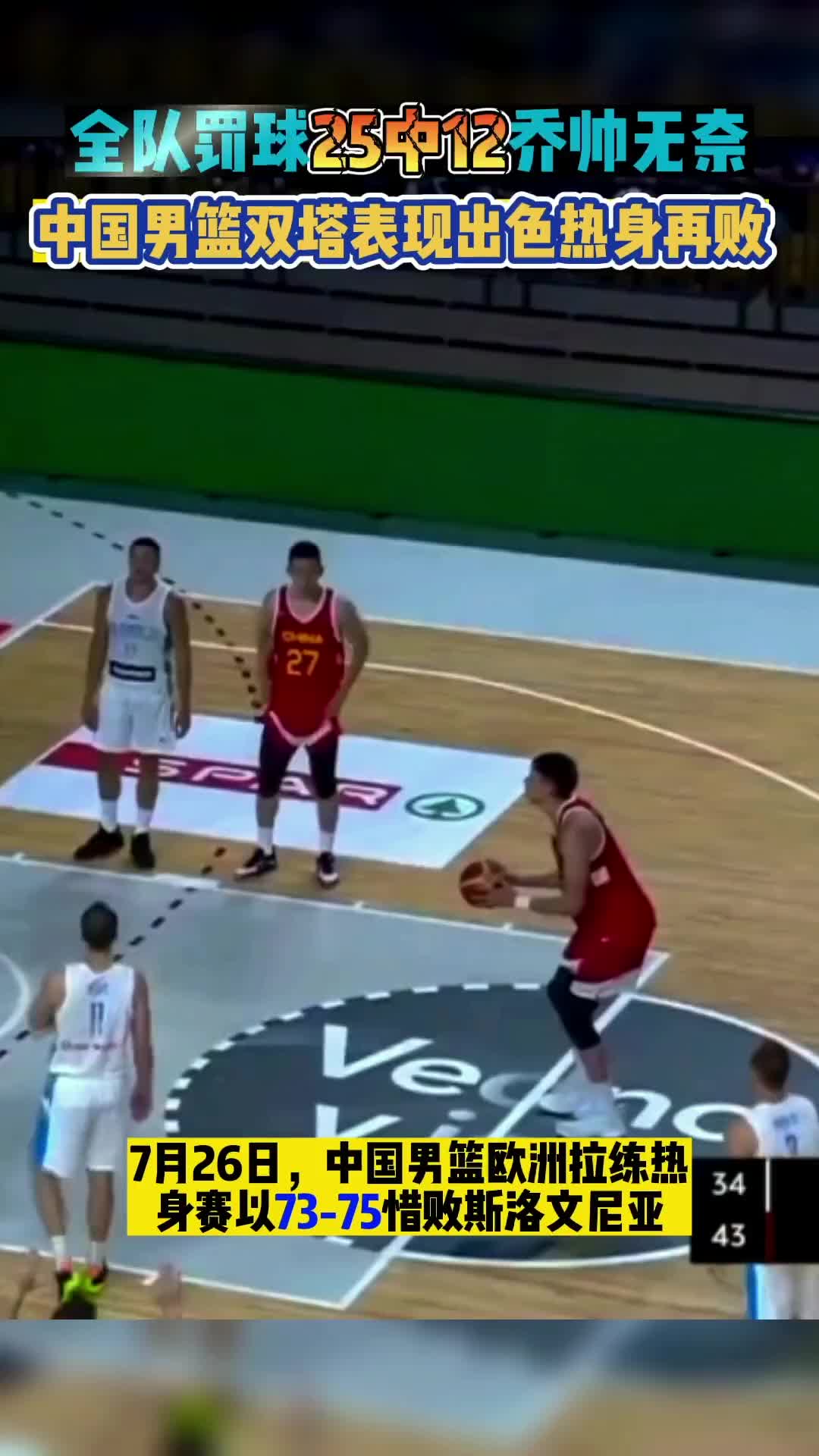 >全场25罚12中!中国男篮热身赛73-75惜败于斯洛文尼亚