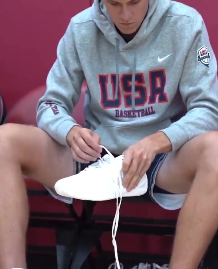 帅气啊!美国队内训练赛间隙,里夫斯在板凳上摆弄自己的球鞋!