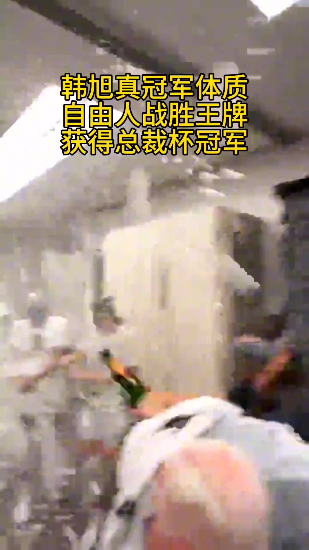 >嗨翻了!自由人夺得总裁杯冠军 韩旭与队友在更衣室喷香槟