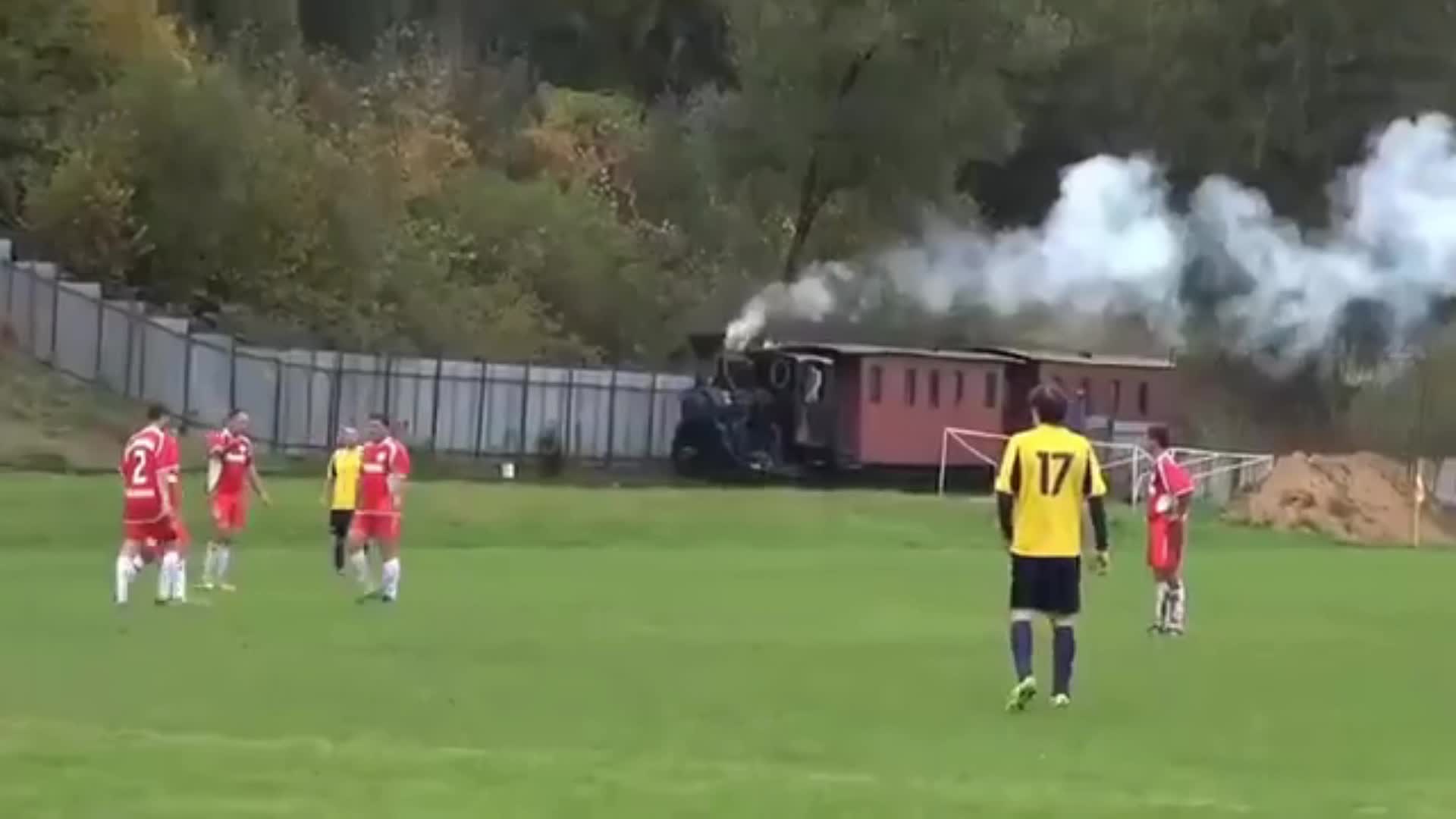 >踢着足球比赛,火车从场边鸣笛缓缓经过!