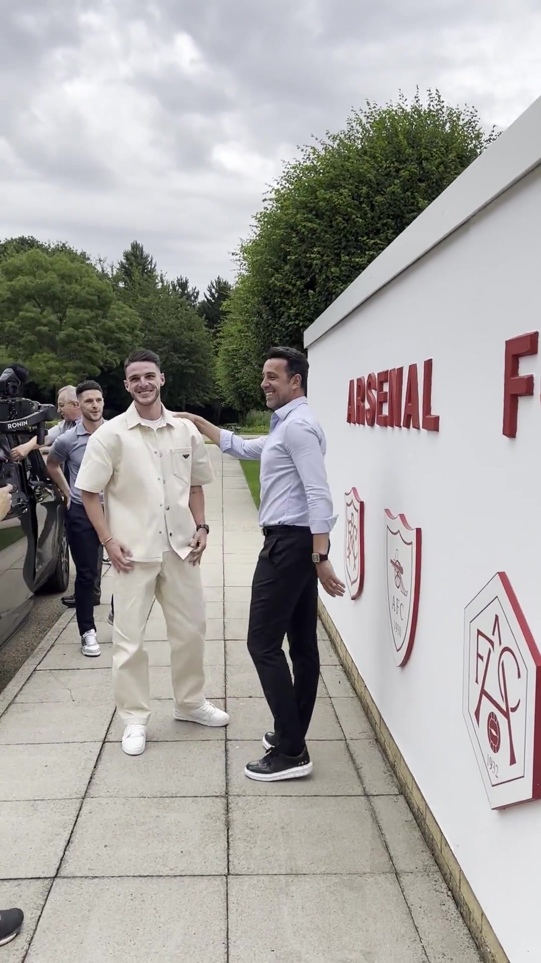 赖斯一身白色休闲装来到阿森纳基地,与枪手总监埃杜拥抱寒暄