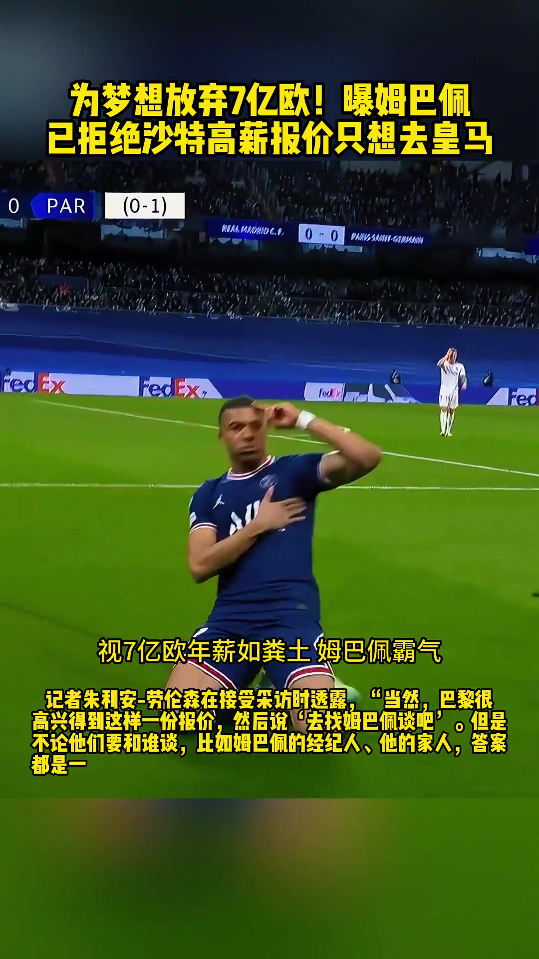 为梦想放弃7亿欧!曝姆巴佩已经拒绝沙特1年7亿欧合同!