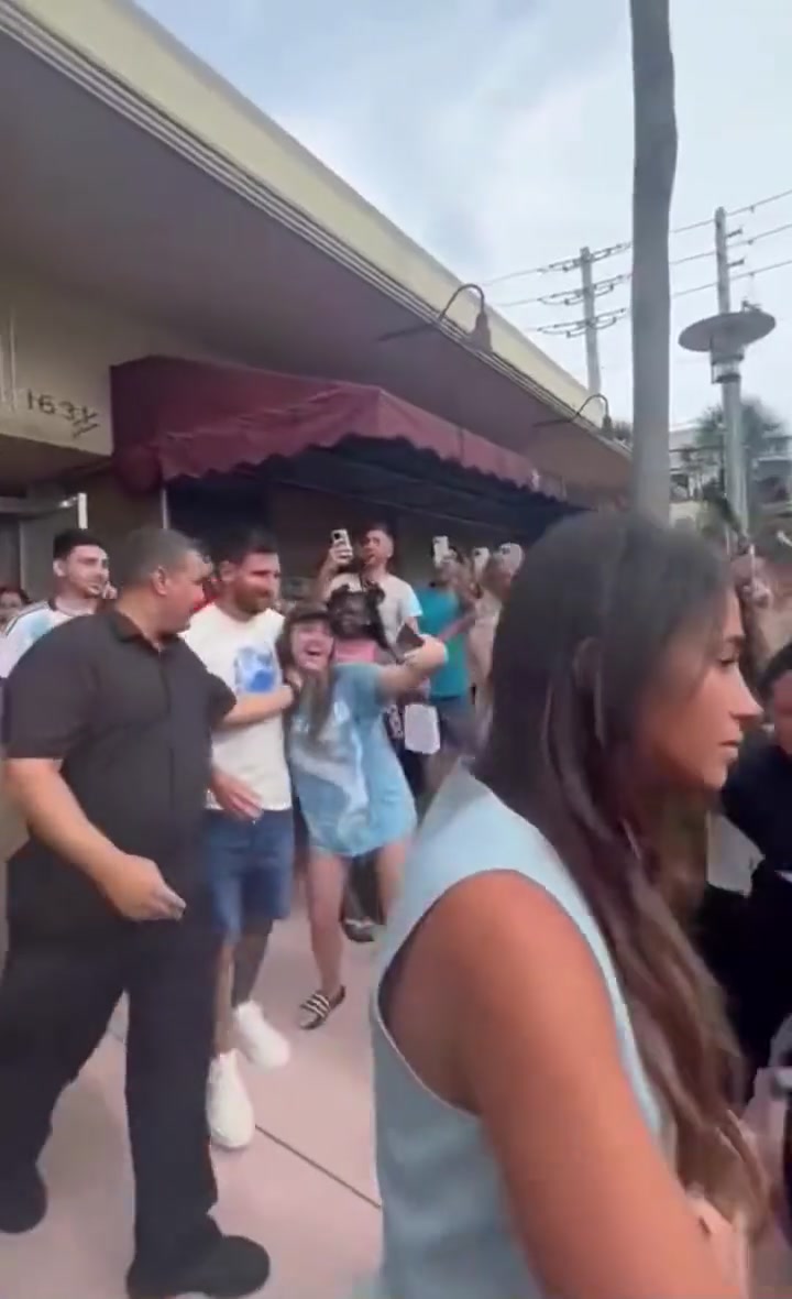 梅西一走出迈阿密商店大门,被女球迷拦腰抱住合影