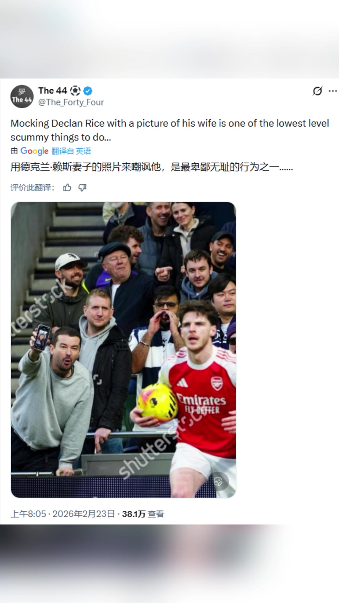>国外博主:热刺球迷用赖斯妻子的照片来嘲讽😡